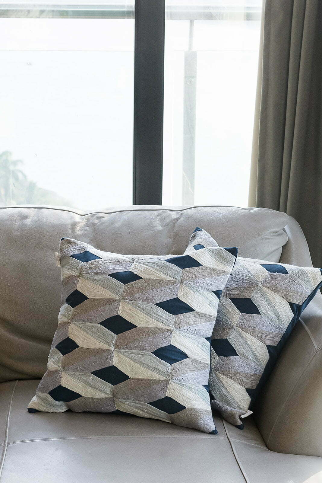Add timeless elegance to your space with our Braid embroidered cushion cover. Featuring a captivating combination of grey-blue and white hues, its unique pattern and intricate embroidery create a captivating focal point. Perfect for any room, its colors are sure to attract attention and elevate your decor.