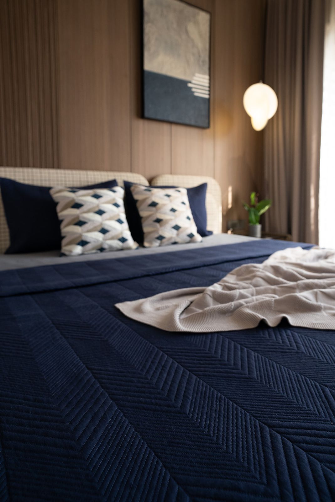 Introducing our New climb Bedspread, featuring a sophisticated thin chevron pattern that adds a touch of timeless elegance to any bedroom. Crafted from high-quality cotton fabric, its deep blue hue effortlessly revitalizes modern interiors. Elevate your space with this understated yet striking piece.