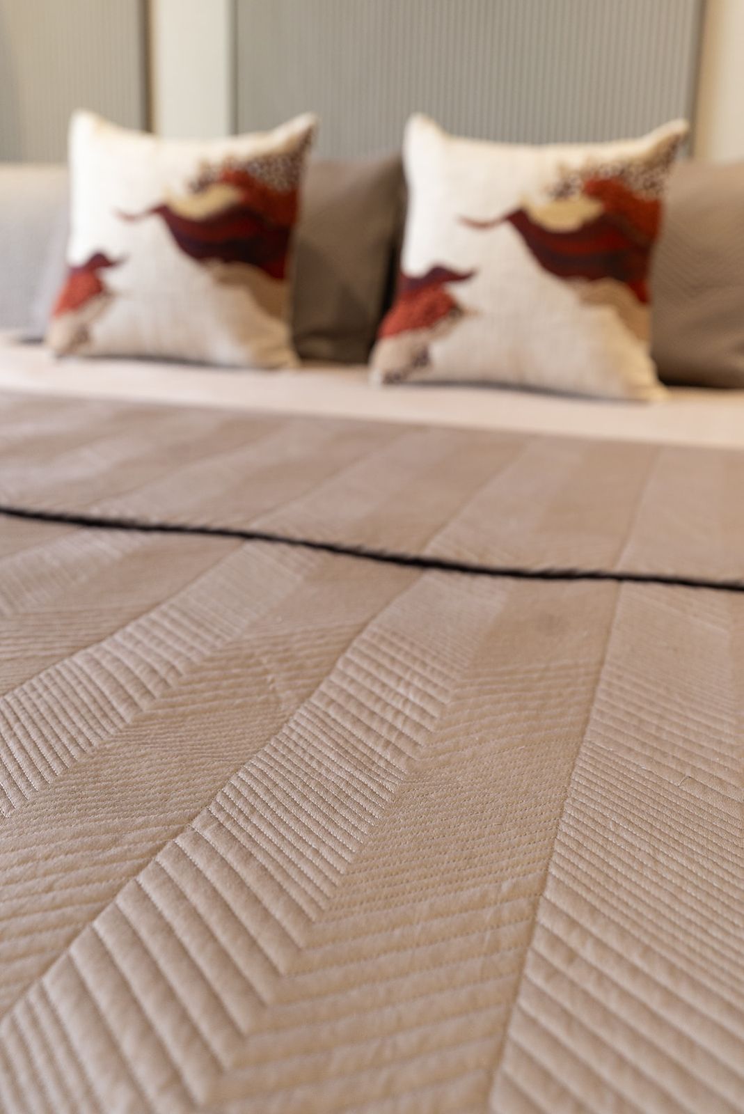 Introducing our New Climb Olive Grey Bedspread, where the timeless allure of intricate chevron patterns meets the serene charm of olive grey. Designed for neutral color lovers, its muted tone effortlessly harmonizes with any interior aesthetic.