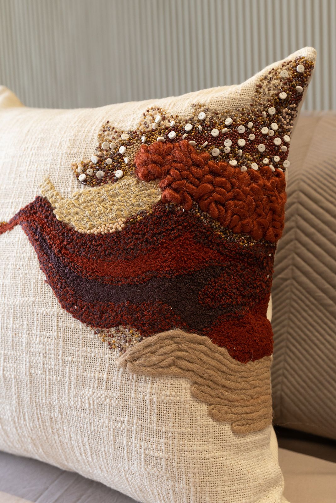 Featuring intricate hand embroidery in rich tones of maroon, rust, and brown, the Ruby cushion cover exudes elegance. Its cotton back ensures comfort and durability, while the handcrafted embellishments add a touch of sophistication. Perfect for both living rooms and as a statement piece in a bedding set, it effortlessly blends style and comfort.